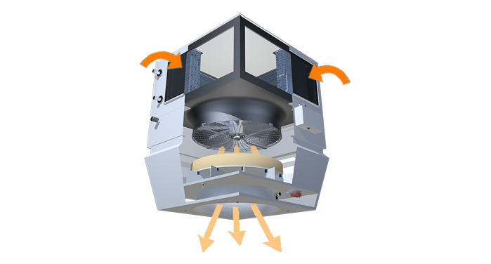 The fan is installed below the air exchanger to control noise level (<60 dB)