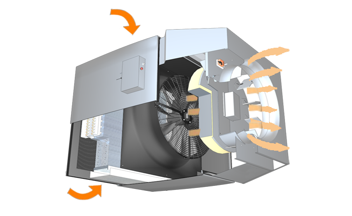 利用安裝于頂部的大風壓軸流風機強制熱空氣下送,熱空氣經過消音海綿和下部梯形收口兩次提壓后,經導流葉片導向后從噴口旋流而出,至上而下將熱空氣均勻分布到空間各處。