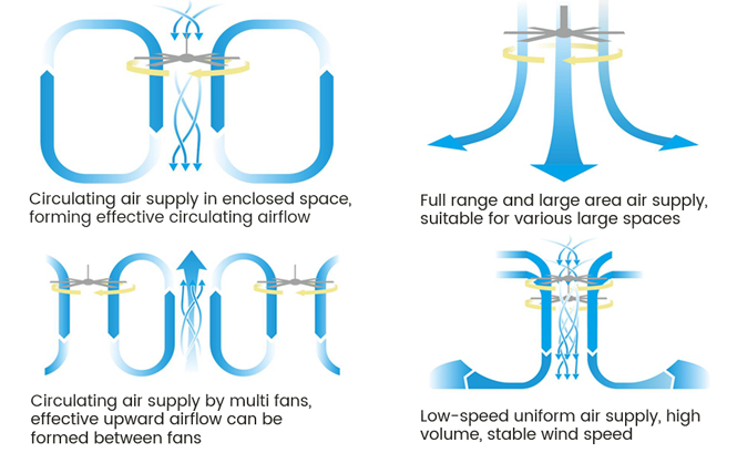 通過強烈的空氣攪動形成循環(huán)氣流場,進而產(chǎn)生大型模擬自然風(fēng)系統(tǒng),加速大空間內(nèi)的空氣流通,大大提高環(huán)境舒適度。